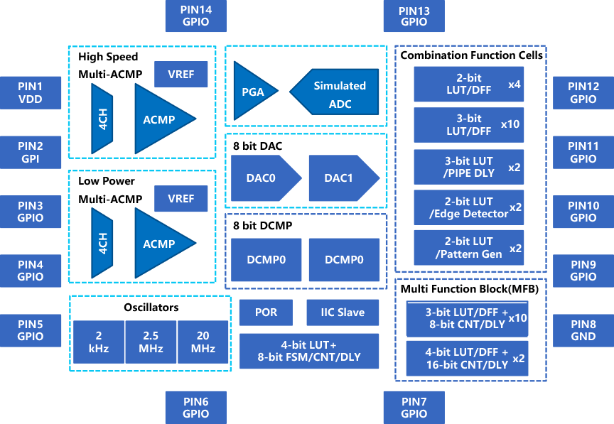 在單個芯片里面集成多種功能器件的IP,通過現場重構方式,任意配置各器件的參數,并實現器件間的任意互聯,并以極高的可靠性實現各種功能電路的技術